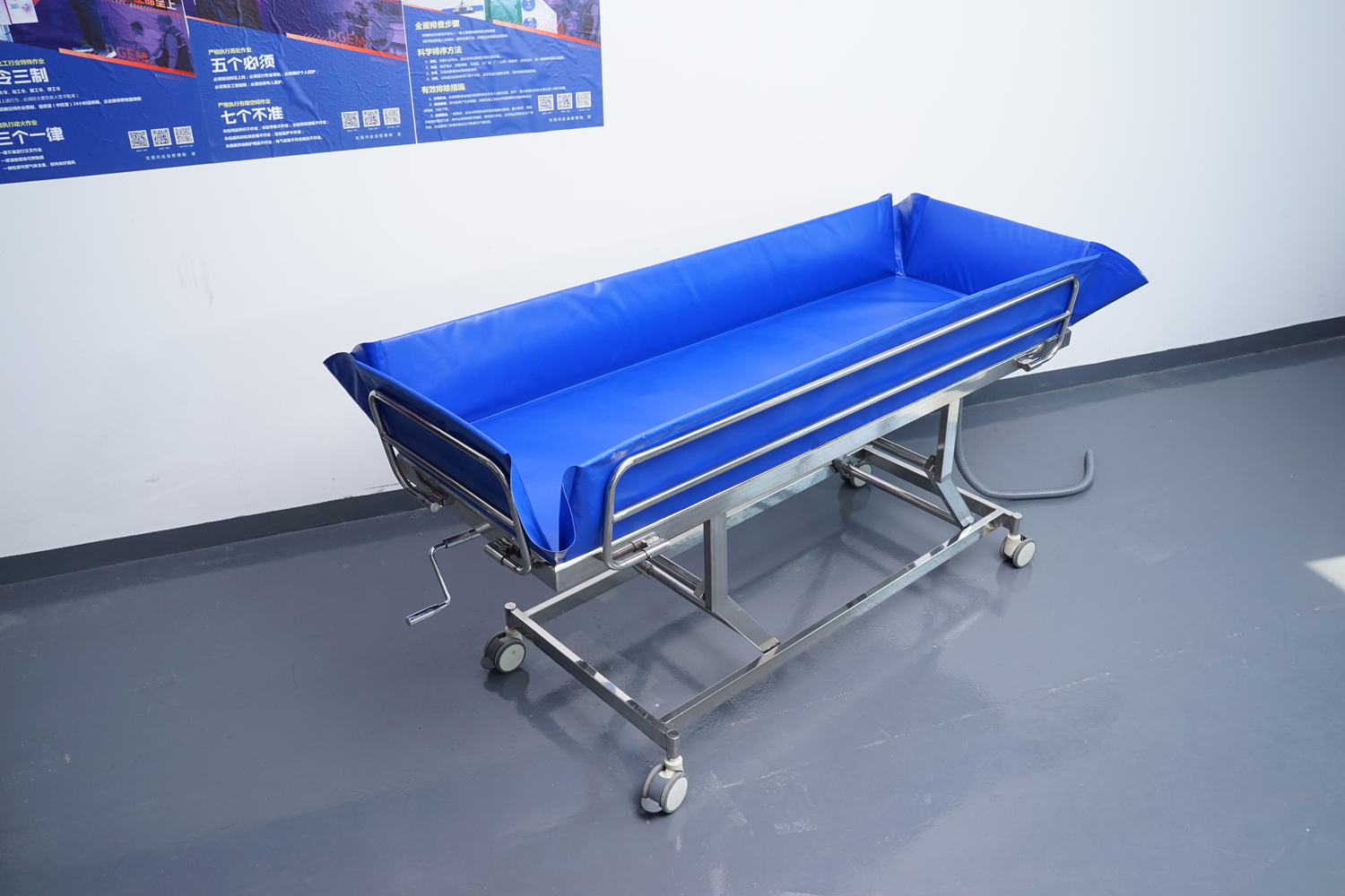 二、規(guī)格參數(shù) 1、床架:高級304#不銹鋼材質(zhì)。 2、浴槽:采用高韌性環(huán)保聚氯乙烯制成,墊內(nèi)夾高密度EVA;柔軟舒適,耐高溫/嚴寒(+80°-10°),不易變型,不易老化;可拆下清潔消毒。 3、尺寸:長1860mm寬650mm高550~900mm(±5%)。 4、操作: 手搖升降。 5、承重:≦130kg。 6、護欄:護欄高270mm,四周護欄皆可180°旋轉(zhuǎn),能直接由睡床轉(zhuǎn)移洗澡者前往沐??;易于洗澡者移動搬運。 7、排水:床體整體傾斜1°,既床頭比床尾高3cm,順暢排水;護欄向外傾斜13度。 8、腳輪/零配件:高級防護萬向剎車輪,移動方便,操作簡單,性能可靠。床架零件均采用304加厚不銹鋼材質(zhì)。 9、配件:軟枕1個,不銹鋼雙層排水軟喉管1條。