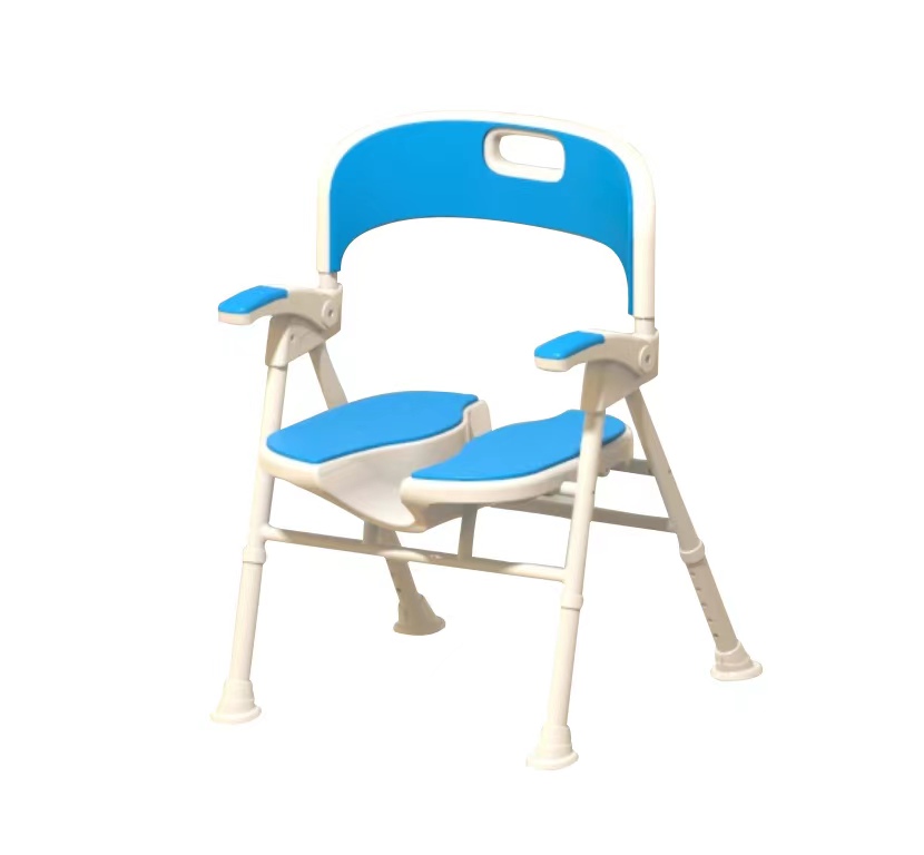 1. 6063T5 reinforced aluminum alloy pipes are adopted, the thickness is 1.2mm, Surface is baking paint. 2. One-piece PE blow molding seat plate, which is thickened and can be pasted with seat cushion. Enlarged and widened one-piece backrest plate is more comfortable for long time sitting. 3. 5 levels of height adjustability, total width:56cm, total length:50cm, total height:74-84cm, seat plate height range:40-50cm, seat depth:39cm, seat width:42cm. 4. One-piece molded nylon handrails can be turned over, which can support user for standing and seating, convenient for clearing. 5. .It's equipped with oversized horseshoe-shaped non-slip footrests, 304 stainless steel screws. 6. Easy folding, out of the box installation-free, barrier-free design. It can stand independently after folded, and save space;
