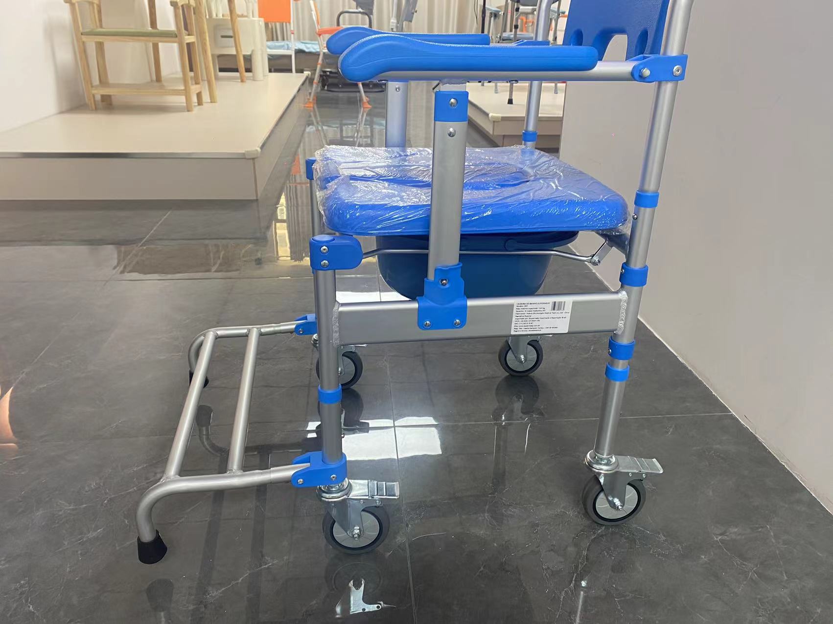 1. The product uses high-strength aluminum alloy, super load-bearing, light weight, easy to carry. Widen and thicken the side tube; 2. Foldable frame, quick closing, armrest upside-down design. Help displacement auxiliary function, easy to use, save volume; 3. Standard high-strength detachable foot, detachable, reversible design can be selected. Improve the sense of passage and experience; 4, optional soft seat and blow molding waterproof seat plate. Meet the needs of various users. Optional backrest cushion; 5, optional mute wheel and standard industrial wheel; 6, new and appearance patented products; 7, the height of the third gear is adjustable, the seat width is 41cm, the seat height is 54-59cm, the total height is 92-97cm, the armrest is 75-80cm.