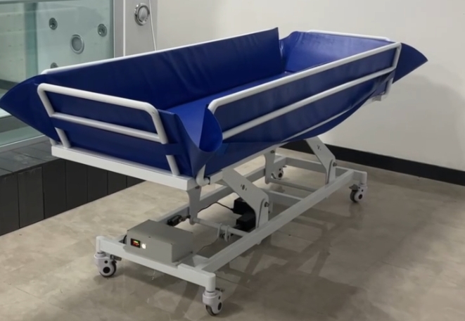 The RH-MY-C bathing bed measures 2000×700×735mm, featuring a 304 stainless steel frame with kayak-grade waterproof foam padding. Its detachable cushion is easy to clean and disinfect, ensuring non-irritating and hypoallergenic performance. The bed boasts 270mm guardrails around all four sides (180° adjustable rotation), a 400mm silent lift mechanism that takes just 30 seconds to complete, and a maximum load capacity of 150kg. Its micro-inclined drainage system activates with a single button press, while omnidirectional casters, anti-collision strips, and remote control allow precise positioning. Powered by a 2200mAh lithium battery, it can support up to 10 users for 20 days on a 3-hour fast charge. With a 70W low-noise push rod and water-electricity separation design, this versatile solution is ideal for hospitals, nursing homes, and residential settings.