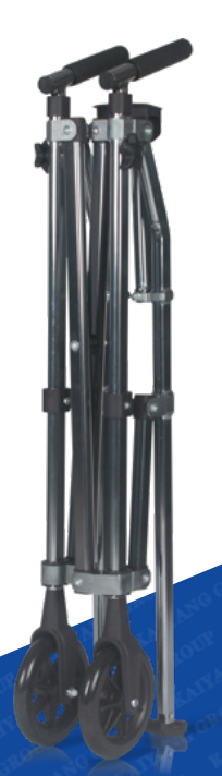 Aluminum alloy oxidation frame ·One button folding switch folds smoothly, easily and conveniently ·PVC adjustable telescopic height handle ·Foldable cross bar makes the product size extremely small ·The front foot of the frame is equipped with 5-inch castors for power assisted sliding ·High elastic wear-resistant anti-skid rubber feet are equipped on the back feet