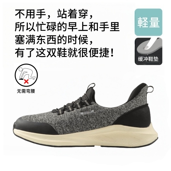 Hands-free shoes that can be put on while standing, without using hands or bending over. They are suitable for the elderly, pregnant women and people with physical inconveniences.