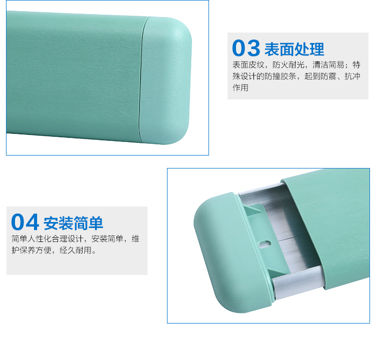 抗菌防撞護板采用高聚物PVC為外飾物,此PVC有防火、防腐、抗菌、易清潔等效果;安裝簡單,津貼墻面,維護保養(yǎng)方便,經(jīng)久耐用;3、款式多樣,寬窄均可,色彩豐富;護板內芯為優(yōu)質鋁合金專業(yè)設計,緊固合理;表面批文,防火耐光,清潔簡易;抗菌防撞護板和抗菌防撞扶手一起使用,整體保護墻面,防撞、抗擊、抗沖。