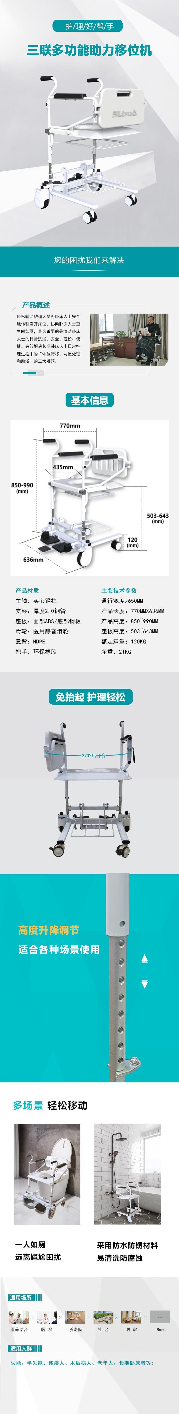 三聯(lián)多功能助力移位機,輕松的解決了照護老人、殘疾人過程中移位、如廁、助浴的三大難題。產(chǎn)品獨創(chuàng)270°后開合設計,免抬起護理更輕松;高度可升降,適合多種場景;整體采用防水防銹材料,易清洗。