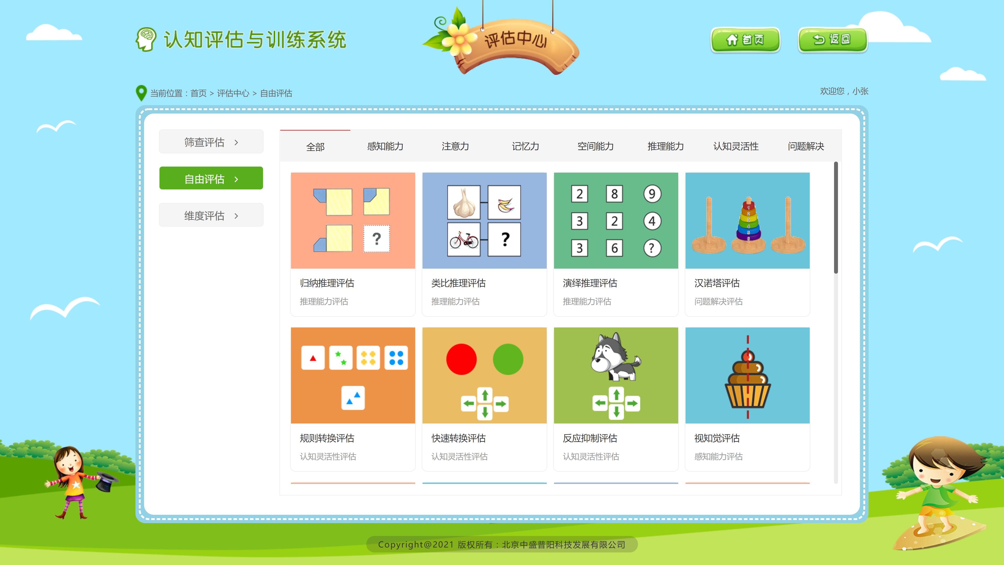認(rèn)知評估與訓(xùn)練系統(tǒng)針對中小學(xué)生認(rèn)知發(fā)展特點,對學(xué)生的感知覺、注意力、記憶力、空間能力、推理能力、認(rèn)知靈活性和問題解決等認(rèn)知能力進(jìn)行綜合評估,同時提供針對各項認(rèn)知能力的專業(yè)訓(xùn)練游戲,來幫助學(xué)生發(fā)展他們各方面的認(rèn)知能力。系統(tǒng)集檔案管理、評估管理、訓(xùn)練管理、數(shù)據(jù)中心、學(xué)習(xí)樂園、個性化方案、系統(tǒng)管理、評估中心、訓(xùn)練中心等功能于一體。