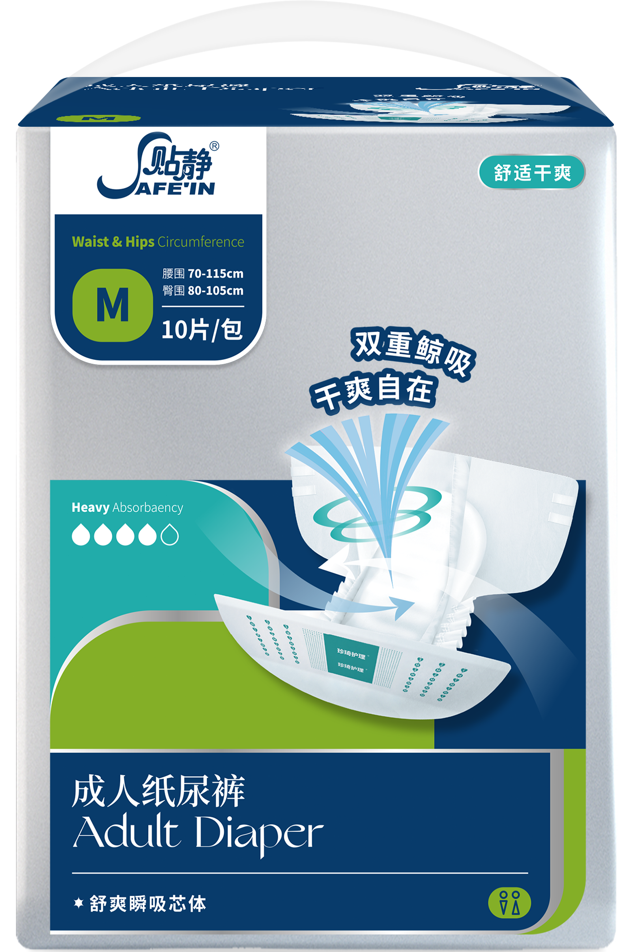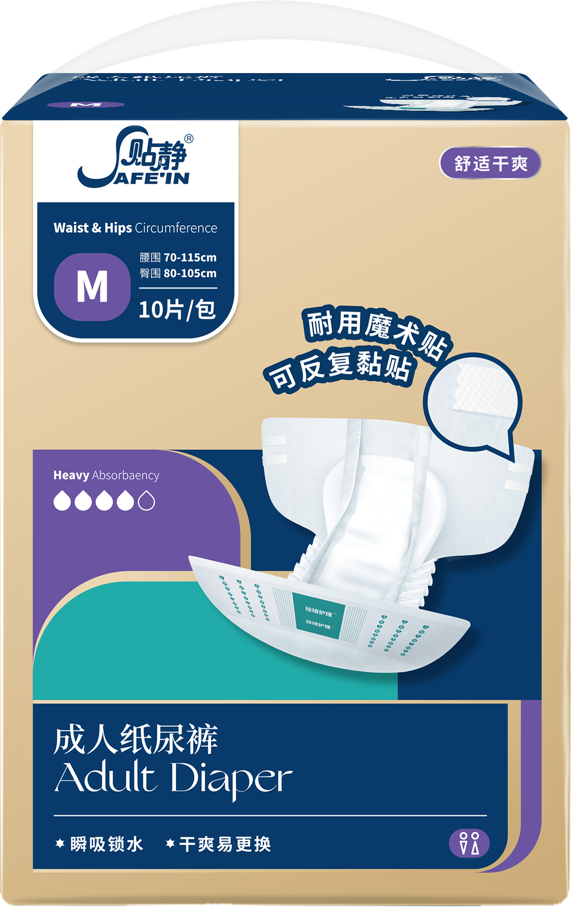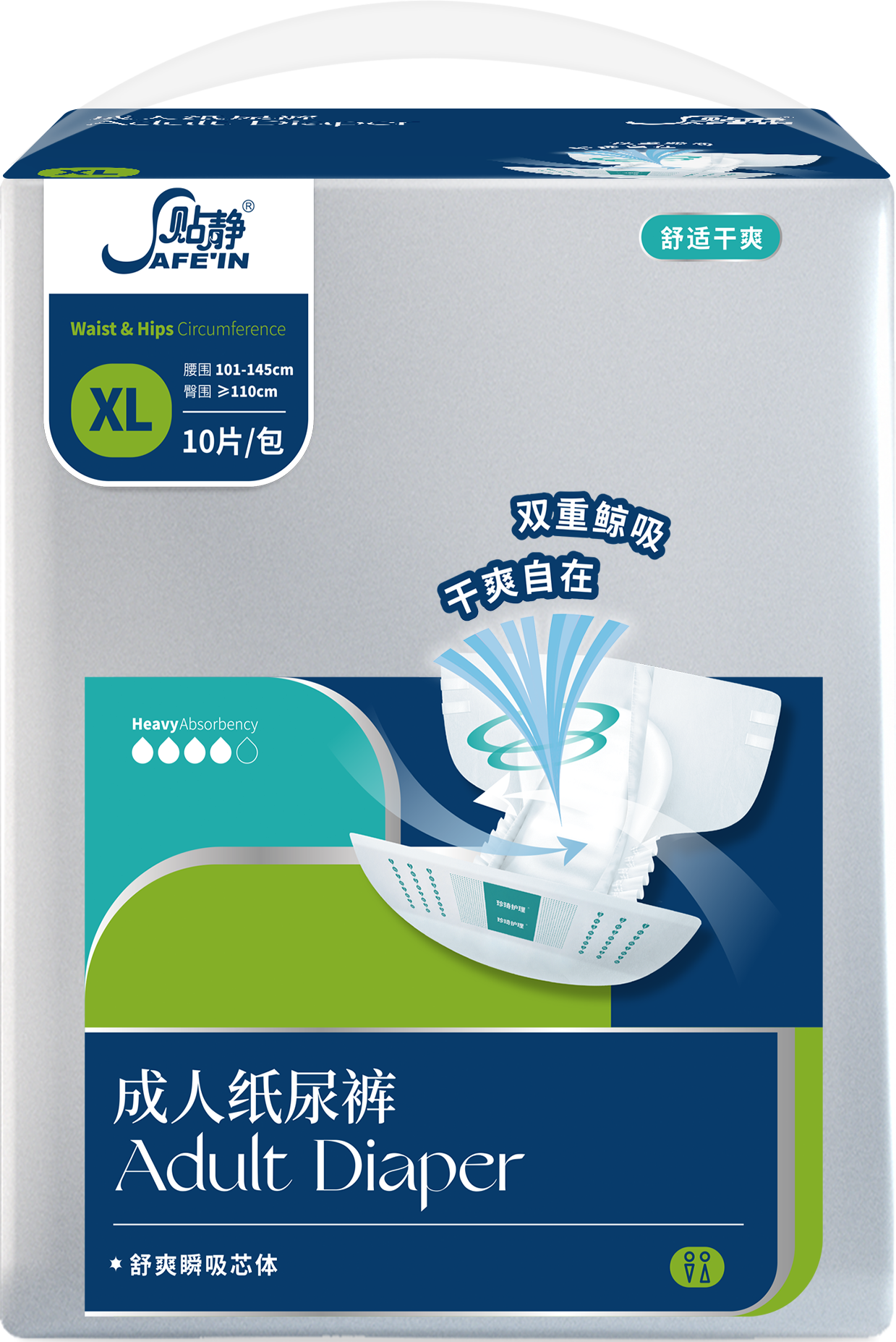貼靜舒爽系列成人紙尿褲 ① 雙重芯體 : SAP高吸收性樹脂+進口毛絨漿,雙芯速吸,干爽舒適低回滲 ② 雙重防漏保護:防漏隔邊+彈性腿圍,拒水的材質(zhì),有效阻擋測漏;柔軟的彈性材質(zhì),減少摩擦不適 ③ PE底膜:柔軟不透水,防潮不悶熱 ④ 前腰貼+左右貼:調(diào)整腰圍大小,居中糾偏,對稱貼,不怕歪 產(chǎn)品結(jié)構(gòu):親膚無紡布面層、木漿+SAP芯體層、防漏護圍、PE底膜