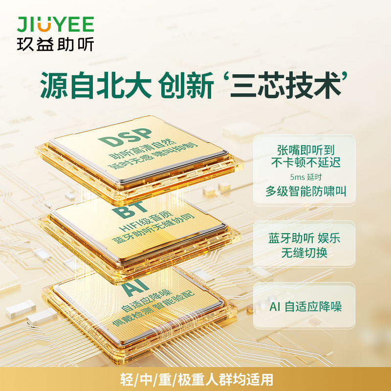 玖益醫(yī)療級智能藍(lán)牙耳背式助聽器(RIC P3 中功率) 適合中度至重度聽損,采用玖益獨創(chuàng)“三芯系統(tǒng)技術(shù)”、55dB滿檔增益,115dB最大聲壓級 ,64通道WDRC及AI降噪技術(shù)、智能驗配APP及遠(yuǎn)程驗配、居家5-8分鐘可完成測聽和驗配,IP67防水,150小時長續(xù)航,暢享舒適溝通。