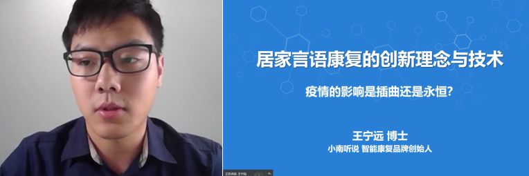 “小南聽說(shuō)”智能康復(fù)品牌創(chuàng)始人、畢業(yè)于美國(guó)明尼蘇達(dá)大學(xué)認(rèn)知與腦科學(xué)專業(yè)的王寧遠(yuǎn)博士結(jié)合了近年來(lái)的技術(shù)發(fā)展,與參會(huì)人員探討了“創(chuàng)新居家言語(yǔ)康復(fù)的理念與技術(shù)--疫情的影響是插曲還是永恒?”這樣一個(gè)話題。在新技術(shù)的加持下,遠(yuǎn)程康復(fù)與居家康復(fù)將會(huì)成為傳統(tǒng)線下康復(fù)模式的必要補(bǔ)充。