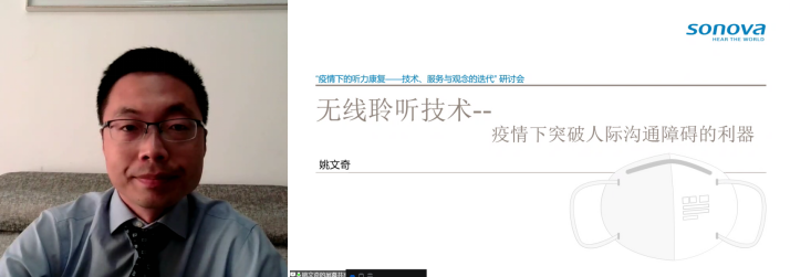 中國(guó)聾人協(xié)會(huì)信息無(wú)障礙委員會(huì)副主任、索諾瓦(Sonova)聽力全國(guó)項(xiàng)目技術(shù)經(jīng)理姚文奇先生為大家分享了“疫情下突破人際溝通障礙的利器——無(wú)線聆聽技術(shù)”的細(xì)節(jié)。