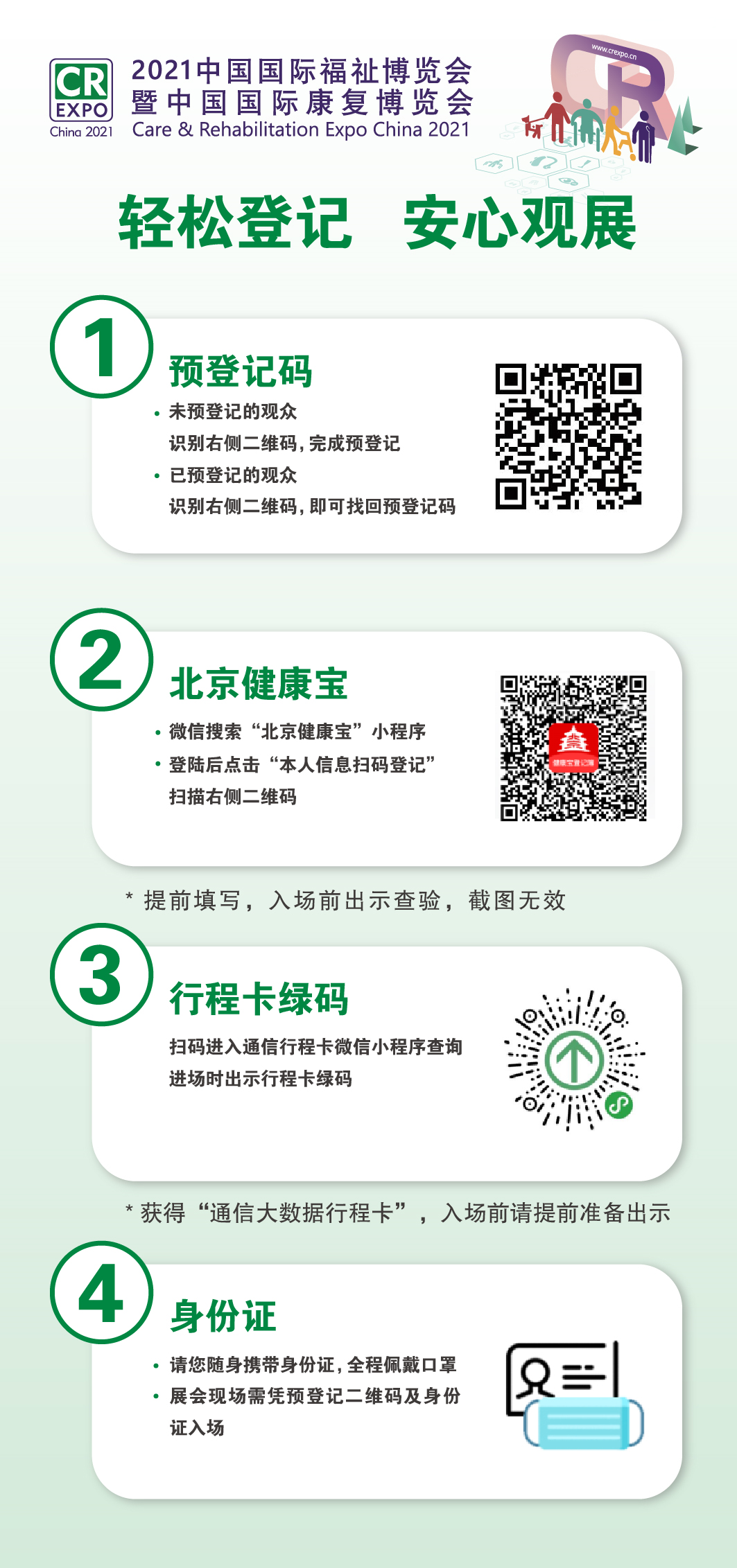 (3)所有進場人員均須實名制登記,出示“北京健康寶+行程碼綠碼“方可進入展館,出示“預登記成功二維碼+身份證” 換取胸卡,方可進入展廳參觀。