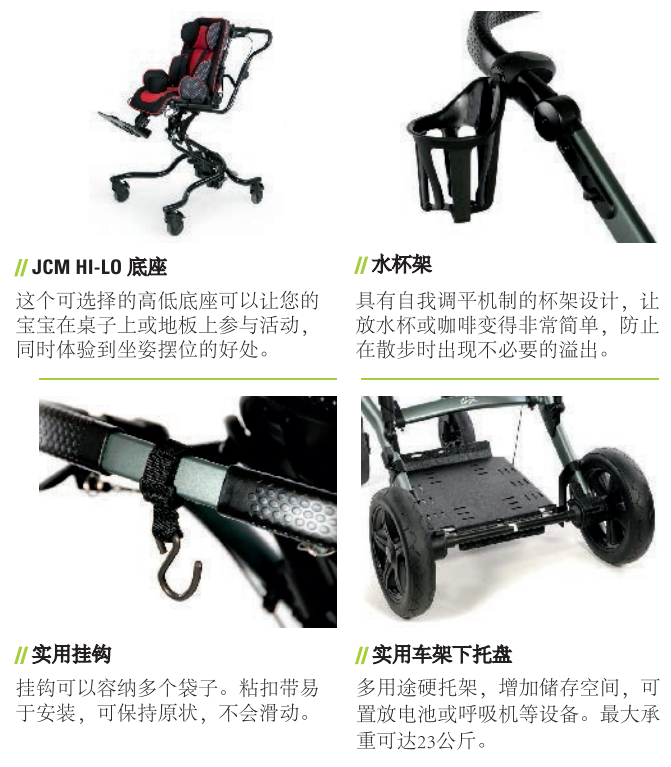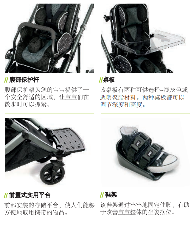 頭部支撐,骨盆帶,胸帶,分腿器,腳踏板,傾斜角度,靠背高度,軀干側向支撐高度寬度,髖關節(jié)支撐高度寬度均可調節(jié),為寶寶提供最貼心的保護。