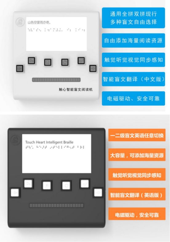 觸心智能盲文閱讀機(jī)有助于解決目前漢語(yǔ)盲文資源嚴(yán)重不足的難題。用戶可以閱讀海量漢語(yǔ)文檔,通用、全拼、現(xiàn)行、雙拼等盲文類型可以自由選擇;觸心智能盲文英語(yǔ)機(jī)有助于解決目前英語(yǔ)盲文資源嚴(yán)重不足的難題。用戶可以閱讀海量英語(yǔ)文檔,一級(jí)英語(yǔ)盲文、二級(jí)英語(yǔ)盲文可以自由選擇。