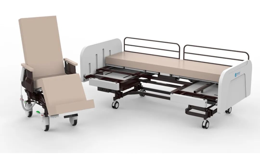 多功能康復(fù)護(hù)理床包括床體部分和輪椅部分,能夠?qū)崿F(xiàn)床體部分與輪椅部分的合體和分離。在合體狀態(tài)下,床體部分和輪椅部分可作為一個(gè)整體,具備一定的護(hù)理功能,能夠?qū)崿F(xiàn)患者的臥姿、起背和曲腿等姿勢的調(diào)整。在分離狀態(tài)下,患者可由醫(yī)護(hù)人員從床體平移到輪椅上,此時(shí)的輪椅處于展平狀態(tài),患者可躺臥在上面,當(dāng)需要轉(zhuǎn)移患者時(shí),可收合輪椅,使患者處于坐姿狀態(tài)。能夠通過合體或分離實(shí)現(xiàn)患者的自由轉(zhuǎn)移。