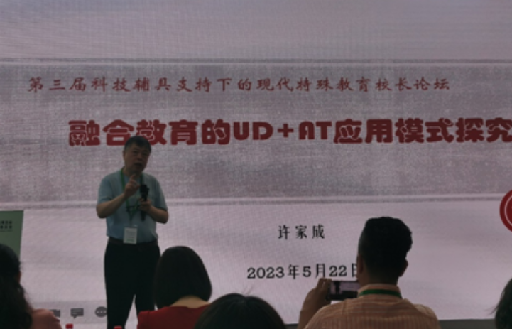 融合教育作為一種新的教育模式,正在逐漸成為特殊教育發(fā)展的趨勢,通過跨學(xué)科融合、技術(shù)融合、文化融合和實踐融合等方式,更好地滿足學(xué)生多元化的教育需求,本屆論壇聚焦“融合教育背景下的UDL+AT的應(yīng)用”,邀請國內(nèi)該領(lǐng)域開展研究與探索的校長們分享融合教育成果與經(jīng)驗,共同探討更加美好的發(fā)展前景。許家成教授首先進(jìn)行了“通用設(shè)計學(xué)習(xí)與科技輔具在融合教育中的應(yīng)用”的主旨報告,他指出,在實際教學(xué)中,通用學(xué)習(xí)設(shè)計能夠充分體現(xiàn)關(guān)注個體、惠及全體學(xué)生的教育理念,輔助技術(shù)則讓特殊兒童教育成為可能,使教學(xué)更為有效。為此,需要推進(jìn)IESP引領(lǐng)下的UD&AT支持模式的實際運(yùn)用,并提出科技輔具支持下的現(xiàn)代特殊教育是教育質(zhì)量提升的有效途徑之一。