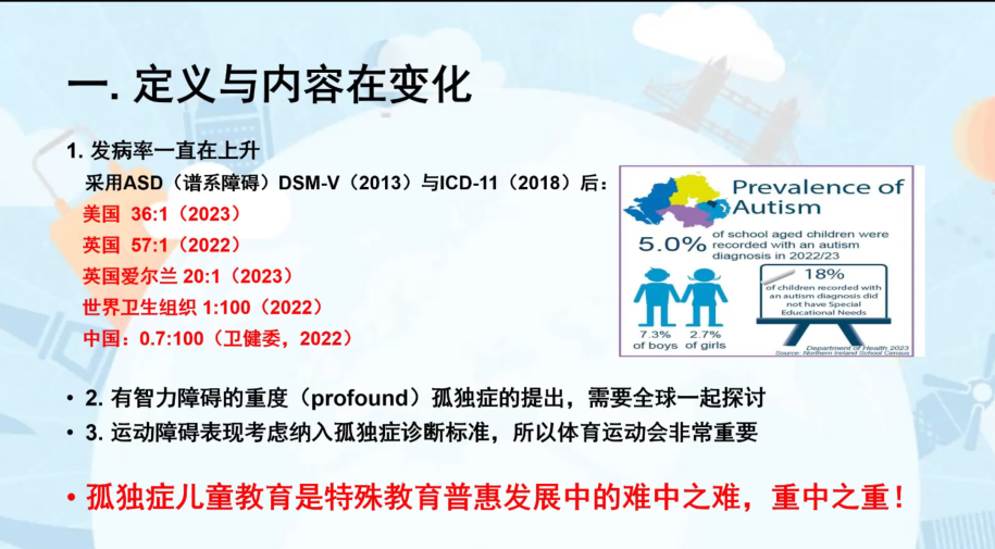 論壇最后,徐云教授作《孤獨癥兒童教育教學的國際新動態(tài)及對我國的啟示》專題講座。他指出,孤獨癥譜系障礙的發(fā)病率一直在上升,孤獨癥兒童教育是特殊教育普惠發(fā)展中的難中之難,重中之重!世界各國均重視孤獨癥教育,紛紛出臺相應教育指南。立足中國特色,要注意本土文化語言體系的表述,遵循兒童身心特征,堅持“育人為本”,將心理學的“知、情、意、行、群”與我國的“德智體美勞”五育并舉課程體系有機對接。徐云教授針對孤獨癥兒童的“教學內(nèi)容”“教學方法”以及“面臨的挑戰(zhàn)”給予針對性講解。他強調(diào),孤獨癥兒童不是學不會,而是沒有機會;不是無潛能,而是沒有被發(fā)現(xiàn)。給予適宜、個性的支持,孤獨癥兒童完全有可能對社會發(fā)展作出巨大貢獻!