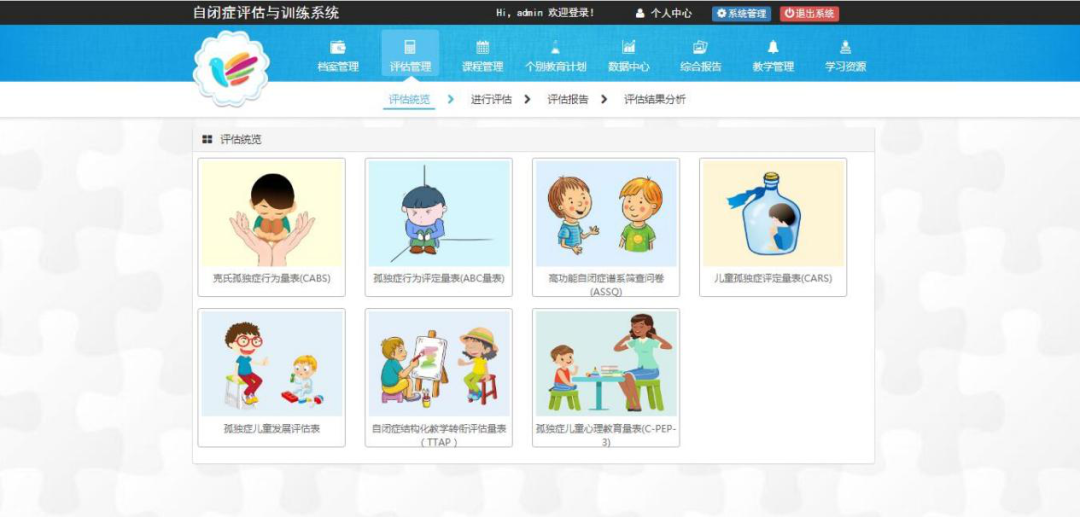 系統(tǒng)內(nèi)置了如:TTAP、C-PEP-3等國內(nèi)外權(quán)威的評估工具,涵蓋了從幼兒到成人的不同年齡階段的自閉癥人群的評估需求。并根據(jù)自閉癥人群的信息加工特點(diǎn)研發(fā)了感知覺、社會交往、語言溝通等八大維度的訓(xùn)練內(nèi)容,教師可以根據(jù)學(xué)生情況設(shè)置有針對性的課程,制定個別教育計(jì)劃,提高了教師的工作效率與工作質(zhì)量,搭建起家校溝通的橋梁。