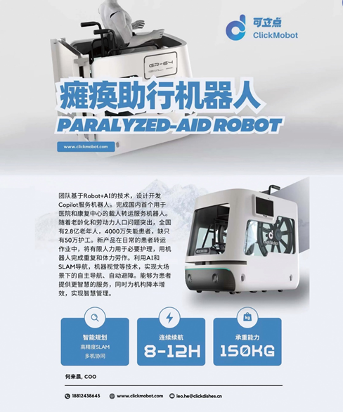 團隊基于Robot+AI的技術(shù),設(shè)計開發(fā)Copilot服務機器人。完成國內(nèi)首個用于醫(yī)院和康復中心的載人轉(zhuǎn)運服務機器人。隨著老齡化問題突出,全國2.8億老年人,4000萬失能患者,卻只有50萬護工。在康復中心的日常轉(zhuǎn)運作業(yè)中,用機器人完成重復和體力勞作。利用AI和SLAM導航,機器視覺等技術(shù),實現(xiàn)大場景下的自主導航、自動避障。能夠為患者提供更智慧的服務,同時為機構(gòu)降本增效,實現(xiàn)智慧管理。用機器完成轉(zhuǎn)運,讓護工照護患者。