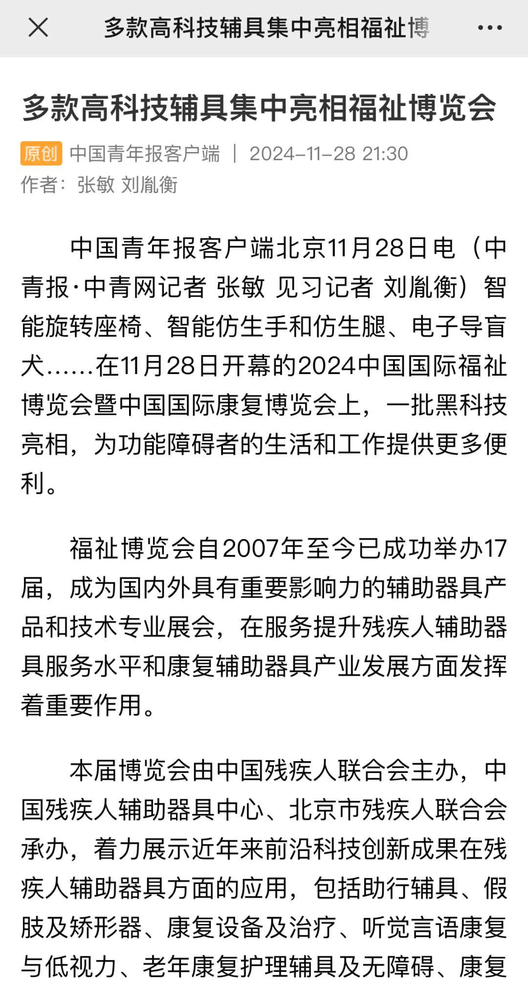展會展示各類產(chǎn)品萬余件,包括外骨骼機(jī)器人、智能康復(fù)訓(xùn)練系統(tǒng)、能幫助聽障者無障礙交流的多語種AI透明屏、能幫助言語障礙者修復(fù)聲音的APP等一系列創(chuàng)新產(chǎn)品,涵蓋殘疾人、老年人出行、生活、醫(yī)療、娛樂等多個(gè)領(lǐng)域。
