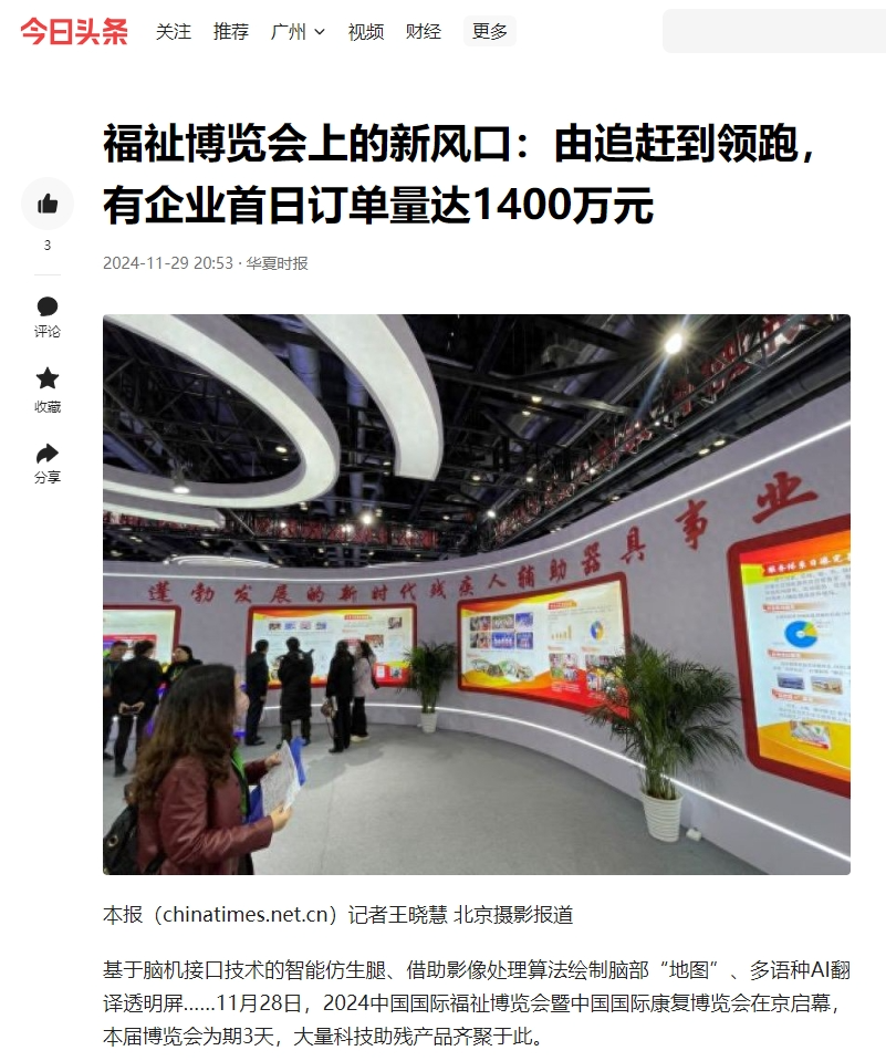 基于腦機接口技術的智能仿生腿、借助影像處理算法繪制腦部“地圖”、多語種AI翻譯透明屏……11月28日,2024中國國際福祉博覽會暨中國國際康復博覽會在京啟幕,本屆博覽會為期3天,大量科技助殘產(chǎn)品齊聚于此。