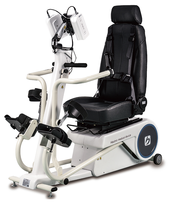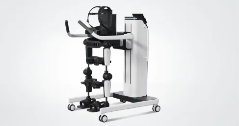 這是一款針對步行功能障礙進(jìn)行高效康復(fù)訓(xùn)練的下肢康復(fù)機(jī)器人。產(chǎn)品由計算機(jī)控制系統(tǒng)、步態(tài)矯正裝置系統(tǒng)、動靜態(tài)減重系統(tǒng)、醫(yī)用跑臺系統(tǒng)以及情景互動訓(xùn)練系統(tǒng)五大模塊組成。它可以使患者在直立體位下通過不斷重復(fù)且軌跡固定的步態(tài)訓(xùn)練,強(qiáng)化正常步態(tài)記憶,促進(jìn)患者本體感覺的輸入與正確運動模式的形成,從而加強(qiáng)大腦結(jié)構(gòu)和功能重塑,建立正確的行走模式并有效的鍛煉其相關(guān)肌肉與關(guān)節(jié),加速下肢功能的恢復(fù)。