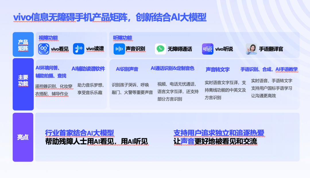 vivo 始終踐行“科技照亮美好未來(lái)”的使命,在無(wú)障礙領(lǐng)域已構(gòu)建起系統(tǒng)性解決方案。聽(tīng)覺(jué)上,“vivo 聽(tīng)說(shuō)”實(shí)時(shí)實(shí)現(xiàn)語(yǔ)音文字互轉(zhuǎn),讓聽(tīng)障朋友接打電話、面對(duì)面交流都順暢;“聲音識(shí)別” 敏銳捕捉嬰兒啼哭、汽車?yán)鹊汝P(guān)鍵音;全球首款“手語(yǔ)翻譯官”更填補(bǔ)空白,識(shí)別1300個(gè)手語(yǔ)詞匯,準(zhǔn)確率超 80%,讓無(wú)聲表達(dá)被讀懂。視覺(jué)上,“vivo 看見(jiàn)”是行業(yè)首個(gè)依托自研多模態(tài)大模型,幫視障朋友描述環(huán)境、讀保質(zhì)期、獨(dú)立逛書(shū)店陪孩子等;“vivo 讀譜”讓盲人免費(fèi)學(xué)鋼琴,不用再依賴厚重盲譜。從單一功能到生態(tài)共建,從技術(shù)創(chuàng)新到公益落地,vivo 的無(wú)障礙之路始終圍繞“有愛(ài),無(wú)礙”的初心。