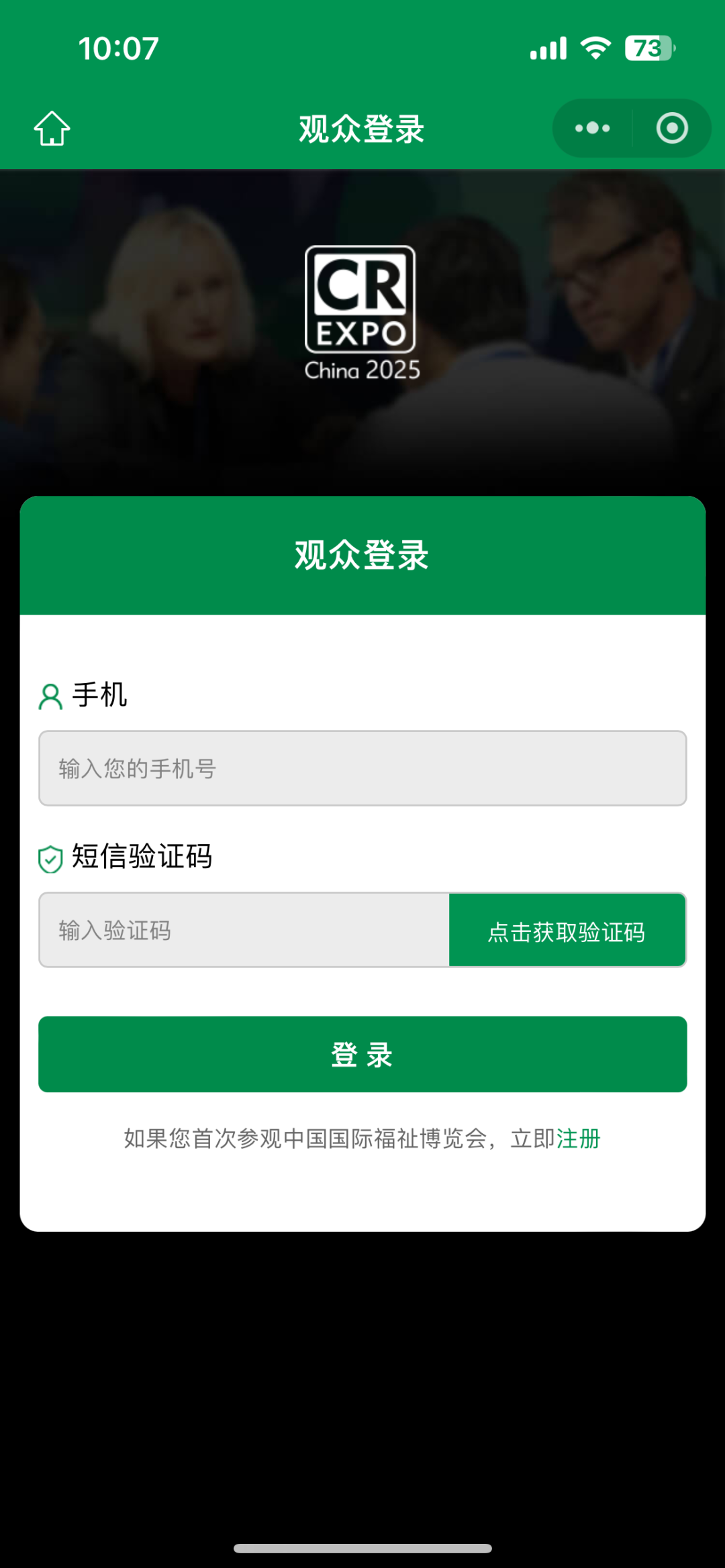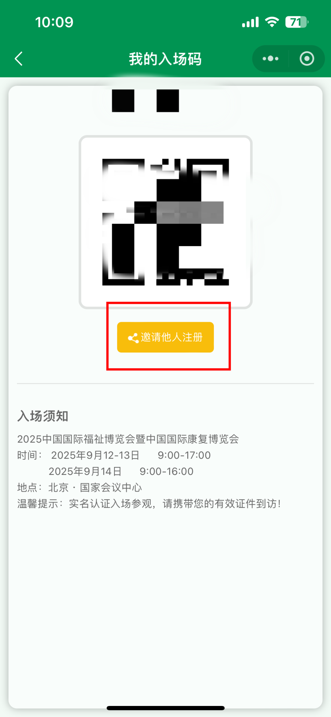 登錄福祉博覽會(huì)官方小程序【福祉在線】→點(diǎn)擊【觀眾登錄】,輸入手機(jī)號(hào)及驗(yàn)證碼→點(diǎn)擊【我的入場(chǎng)碼】,生成您的專屬邀請(qǐng)鏈接。