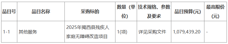 采購需求:采購包1(2025年揭西縣殘疾人家庭無障礙改造項(xiàng)目)