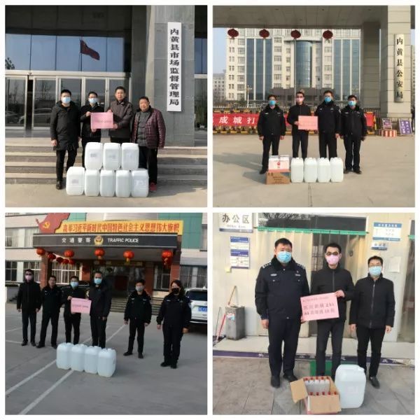 向內(nèi)黃縣市場監(jiān)管局、公安局、內(nèi)黃縣交警大隊(duì)、長慶路派出所捐贈醫(yī)用酒精、84消毒液
