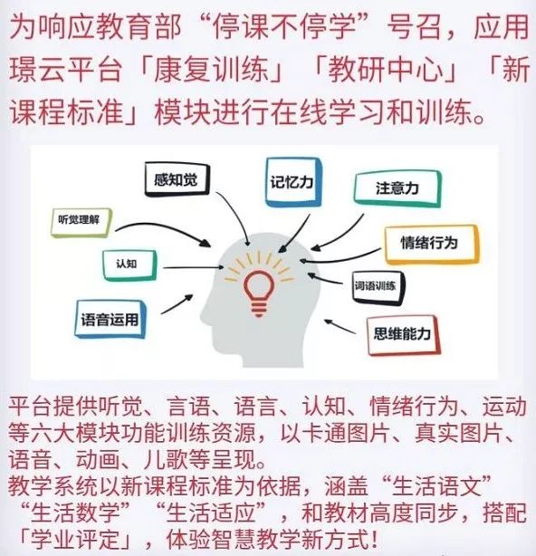 為應(yīng)對因?yàn)橐咔槎鴮?dǎo)致的推遲開學(xué),解決學(xué)校和學(xué)生無法面對面授課的問題,疫情期間璟云平臺向特殊教育工作者及家庭免費(fèi)注冊開放,實(shí)現(xiàn)特殊教育的停課不停學(xué)!