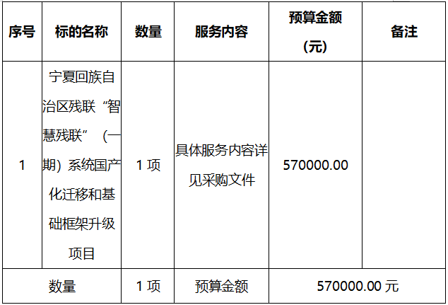 寧夏回族自治區(qū)殘聯(lián)“智慧殘聯(lián)”(一期)系統(tǒng)國(guó)產(chǎn)化遷移和基礎(chǔ)框架升級(jí)項(xiàng)目競(jìng)爭(zhēng)性磋商公告