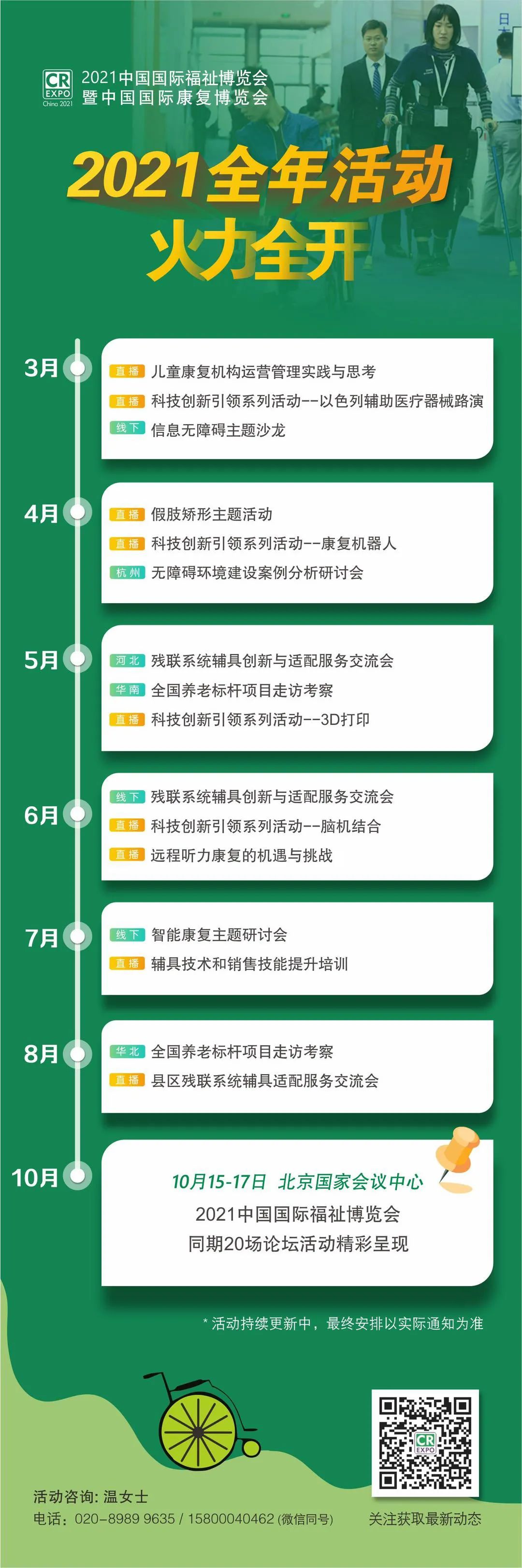 緊貼政策導(dǎo)向,融合行業(yè)資源,CR EXPO 2021重磅推出“全年活動計劃”:“屏對屏”交流,發(fā)現(xiàn)輔具新應(yīng)用、新技術(shù)、新機遇;“面對面”商談,走訪標桿項目,探討行業(yè)熱點……