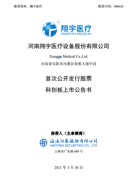 3月30日,河南翔宇醫(yī)療設備股份有限公司(以下簡稱“翔宇醫(yī)療)發(fā)布《首次公開發(fā)行股票科創(chuàng)板上市公告書》。