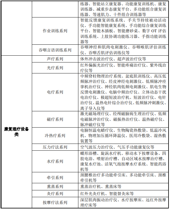 康復器械產品種類繁多,按照應用領域的不同,可分為康復醫(yī)療器械、康復教育設備和康復輔具等。康復醫(yī)療器械指在康復醫(yī)療中用于康復評定、訓練與治療、有效改善或恢復患者功能的醫(yī)療設備,是康復器械的主要組成部分,也是各級康復醫(yī)療機構開展診療活動的必備條件;而康復醫(yī)療器械按照作用的不同,又可分為康復評定設備、康復訓練設備以及康復理療設備。