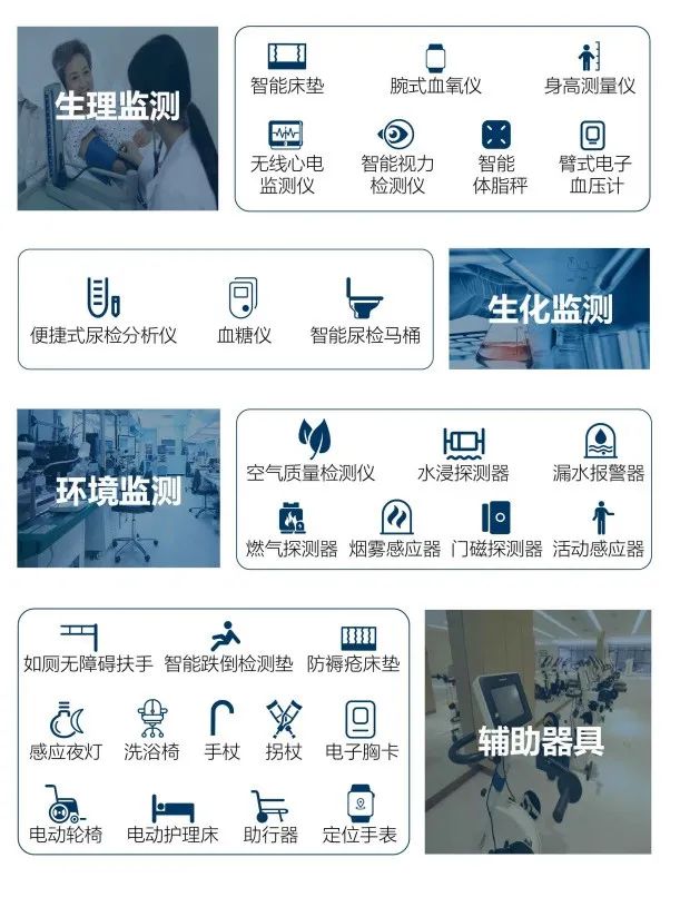 派博的智慧養(yǎng)老“4+3”模型中,“4”代表著四大品類硬件,即生理監(jiān)測、生化監(jiān)測、環(huán)境監(jiān)測、輔助器具,對應(yīng)的具體產(chǎn)品如下:
