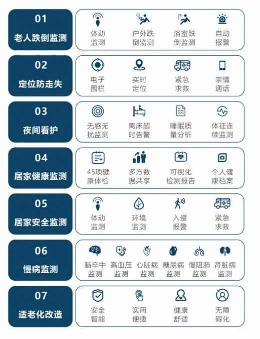 老人跌倒監(jiān)測、定位防走失、夜間看護(hù)、居家健康監(jiān)測、慢病監(jiān)測、適老化改造、居家安全監(jiān)測,是養(yǎng)老服務(wù)中的7大需求。