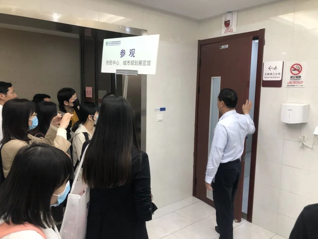 參觀團(tuán)來到市民中心門口,首先看到的是無障礙坡道。坡道的扶手上刻有盲文,能為視障人士提供行走路線信息。