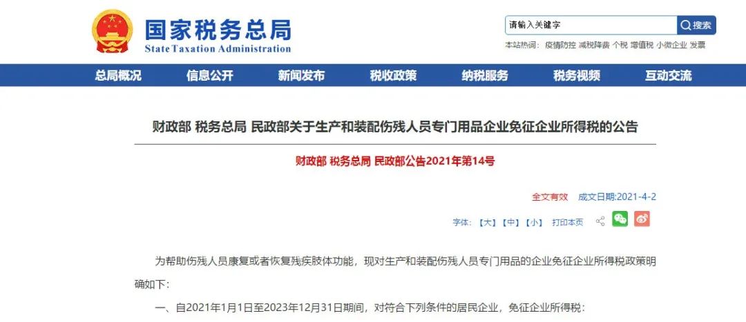 2021年4月2日,財(cái)政部、稅務(wù)總局、民政部聯(lián)合發(fā)布《關(guān)于生產(chǎn)和裝配傷殘人員專門用品企業(yè)免征企業(yè)所得稅的公告》,宣布自2021年1月1日至2023年12月31日期間,對生產(chǎn)和裝配傷殘人員專門用品企業(yè)免征企業(yè)所得稅。