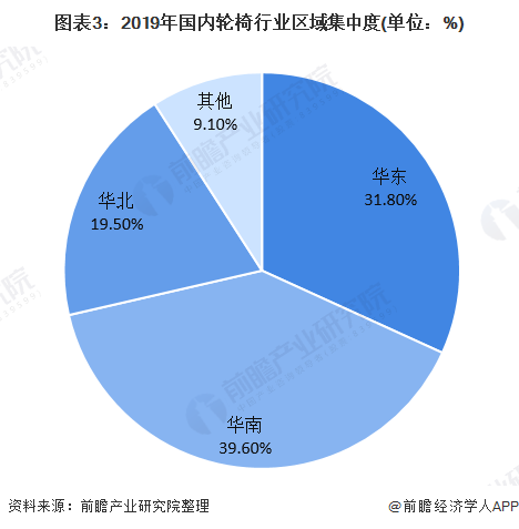 我國輪椅主要的生產(chǎn)基地集中在上海、廣東、江浙和天津等地區(qū),華南、華東地區(qū)占據(jù)主要市場。截止2019年,我國國內輪椅行業(yè)區(qū)域集中度分別為華東31.8%,華南39.6%,華北19.5%,其他9.1%。
