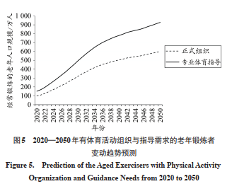 本研究基于體育強(qiáng)國建設(shè)與人口老齡化的現(xiàn)實(shí)背景,利用人口預(yù)測和增長曲線擬合的方法對我國“十四五”期間和中長期的老年體育鍛煉人口的規(guī)模和結(jié)構(gòu)變動趨勢進(jìn)行了預(yù)測。第一,我國參加體育鍛煉的老年人口總體規(guī)模將持續(xù)增長,“十四五”末期將達(dá)到8 471萬人,到2035年達(dá)到1.9億人,2050年達(dá)到2.6億人。第二,未來經(jīng)常參加體育鍛煉的老年人口年齡結(jié)構(gòu)將進(jìn)一步老化,高齡老年人占老年體育鍛煉者的比重有所上升。第三,參與各類體育活動項目的老年鍛煉者將快速增長,預(yù)計到2050年左右將有超過2億人規(guī)模的老年人經(jīng)常進(jìn)行步行鍛煉。第四,各類場地需要承載的老年鍛煉者規(guī)模持續(xù)擴(kuò)大,公園、廣場類需要承載的老年體育鍛煉者將在2050年達(dá)到1.8億人的規(guī)模。第五,老年人鍛煉時對正式組織和專業(yè)指導(dǎo)人員的需求將持續(xù)增加,到2050年約有600萬老年人需要通過正式組織的方式進(jìn)行鍛煉,約927萬老年人需要專業(yè)體育指導(dǎo)人員進(jìn)行指導(dǎo)。