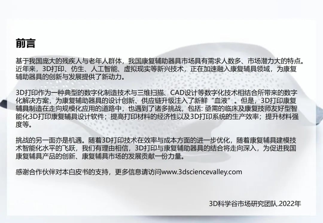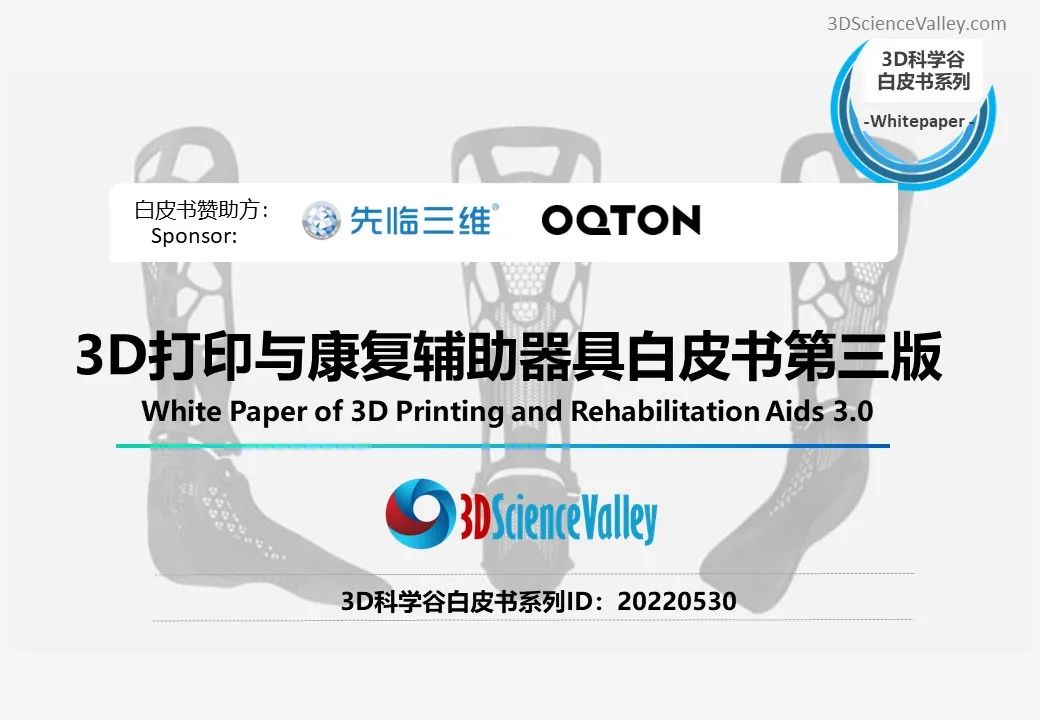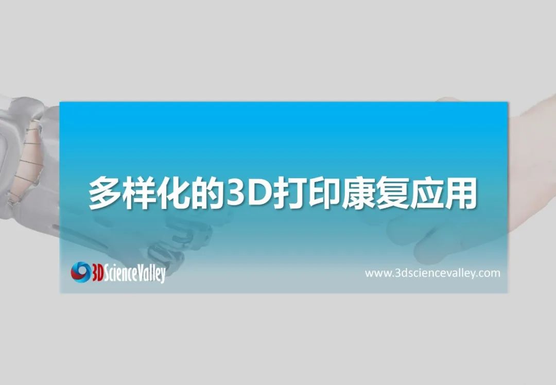 3D科學(xué)谷第三版《3D打印與康復(fù)輔助器具白皮書(shū)》,從康復(fù)醫(yī)療市場(chǎng)、多樣化的3D打印康復(fù)應(yīng)用、康復(fù)輔具設(shè)計(jì)及行業(yè)標(biāo)準(zhǔn)三大版塊,剖析康復(fù)輔具市場(chǎng)前景、挑戰(zhàn),3D打印技術(shù)與康復(fù)輔具制造的應(yīng)用結(jié)合點(diǎn),以及推動(dòng)3D打印康復(fù)輔具應(yīng)用走向深入的積極因素。