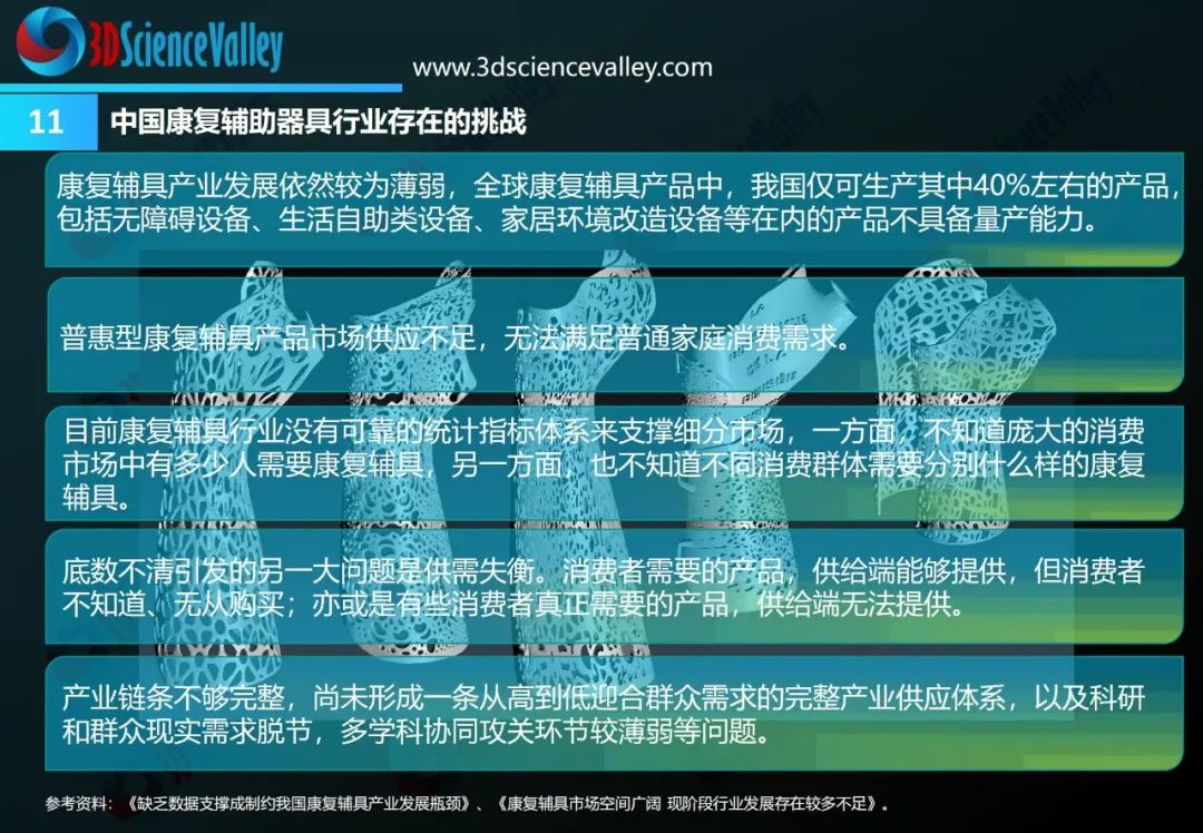 挑戰(zhàn)的另一面亦是機(jī)遇。隨著3D打印技術(shù)在效率與成本方面的進(jìn)一步優(yōu)化,隨著康復(fù)輔具建模技術(shù)智能化水平的飛躍,我們有理由相信,3D打印與康復(fù)輔助器具的結(jié)合將走向深入,為促進(jìn)我國(guó)康復(fù)輔具產(chǎn)品的創(chuàng)新、康復(fù)輔具市場(chǎng)的發(fā)展貢獻(xiàn)一份力量。