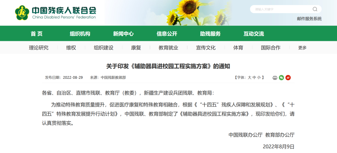 為推動(dòng)特殊教育質(zhì)量提升,促進(jìn)醫(yī)療康復(fù)和特殊教育相融合,根據(jù)《“十四五”殘疾人保障和發(fā)展規(guī)劃》、《“十四五”特殊教育發(fā)展提升行動(dòng)計(jì)劃》,中國(guó)殘聯(lián)、教育部制定了《輔助器具進(jìn)校園工程實(shí)施方案》,現(xiàn)印發(fā)給你們,請(qǐng)認(rèn)真貫徹落實(shí)。