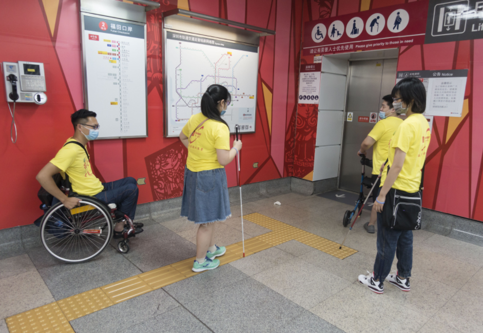 現(xiàn)如今在深圳,走進(jìn)任何一個(gè)地鐵站,映入眼簾的都是色澤鮮艷的黃色盲道,同時(shí)幾乎每個(gè)站點(diǎn)都設(shè)有無障礙電梯(垂直電梯),無障礙電梯出入口前設(shè)有無障礙通道供行動不便或持大件行李、推嬰兒車等乘客方便地進(jìn)出。