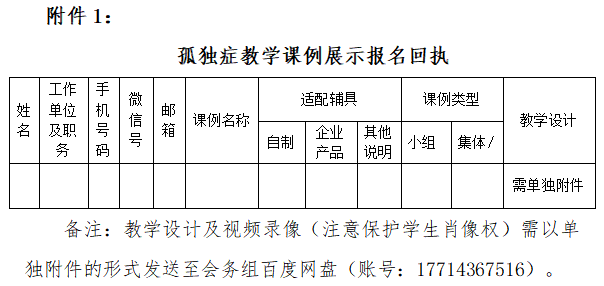 課例類型不限(不建議個(gè)訓(xùn),鼓勵(lì)集體或小組課,盡量使用相關(guān)教具、學(xué)具或輔具)。鼓勵(lì)老師們自己制作輔具,不容許出現(xiàn)廠家名字或任何企業(yè)標(biāo)志及信息。參加單位需同時(shí)提供輔具名稱和孤獨(dú)癥學(xué)生的教學(xué)設(shè)計(jì)方案及視頻錄像(注意保護(hù)學(xué)生肖像權(quán)),MP4格式,確保視頻清晰,總時(shí)長(zhǎng)20-35分鐘,主要與孤獨(dú)癥相關(guān)的教學(xué)內(nèi)容與過(guò)程要在屏幕上有文字顯示。成果一經(jīng)征集,頒發(fā)證書。