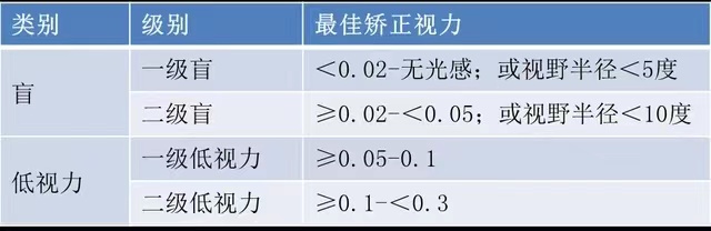 我國將視力殘疾分為盲和低視力兩類,雙眼中好眼最佳矯正視力低于0.3而等于或優(yōu)于0.05者為低視力;雙眼中好眼最佳矯正視力低于0.05者稱為盲,具體分類標(biāo)準(zhǔn)對照表如下: