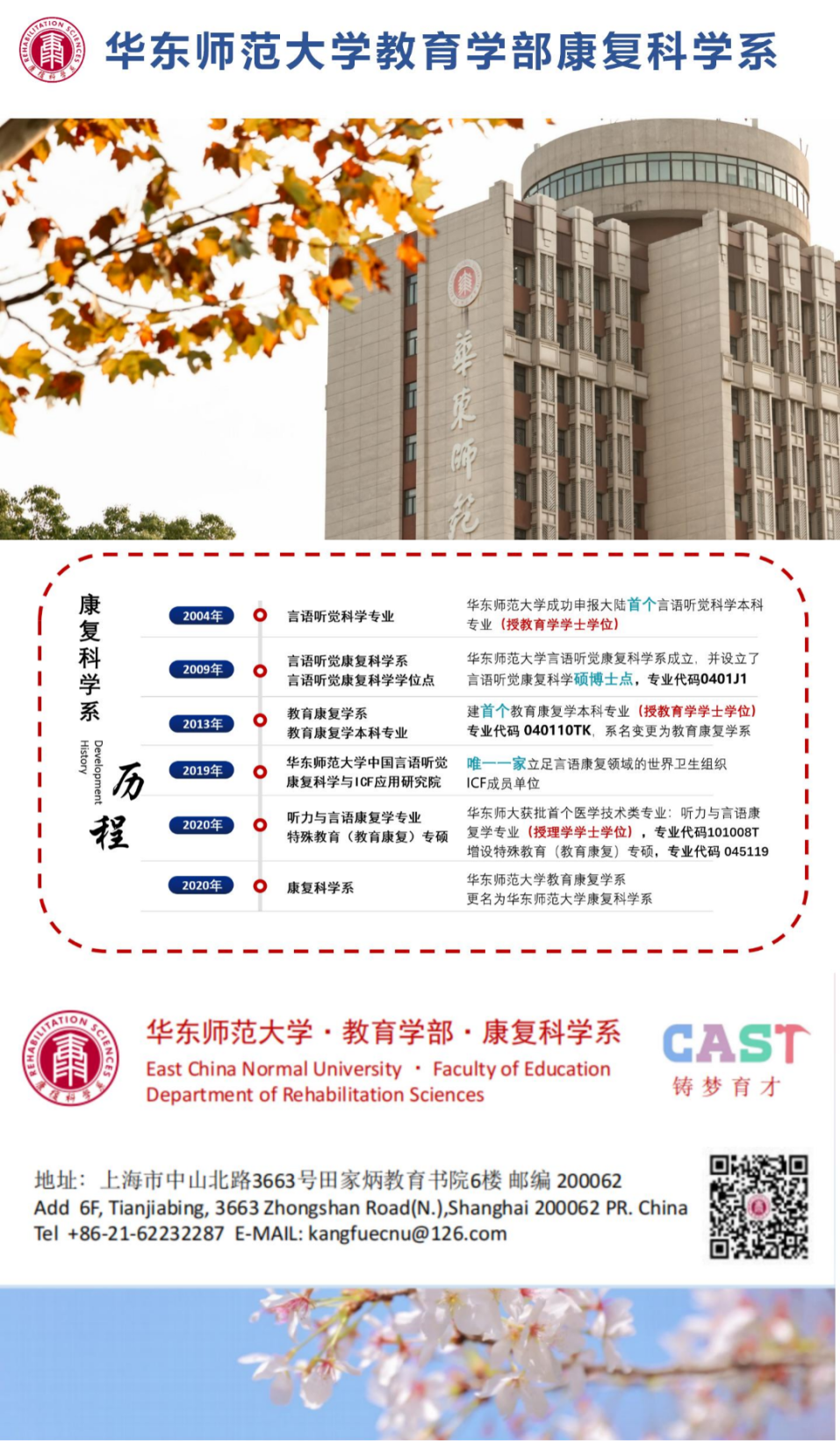 華東師范大學(xué)教育學(xué)部康復(fù)科學(xué)系始發(fā)于2004年我國大陸創(chuàng)建的首個言語聽覺科學(xué)專業(yè)。經(jīng)過近20年的建設(shè)努力,目前已發(fā)展成為本科、碩士和博士學(xué)位授予點齊全的專業(yè),包括教育康復(fù)學(xué)、聽力與言語康復(fù)學(xué)兩個本科專業(yè)、言語聽覺康復(fù)科學(xué)碩博士點,以及特殊教育(教育康復(fù))專業(yè)碩士點。學(xué)生就業(yè)方向包括高校、特教學(xué)校、耳鼻喉科、口腔科,康復(fù)科、兒童保健科、康復(fù)機構(gòu)等不同領(lǐng)域。熱忱歡迎海內(nèi)外學(xué)子報考本專業(yè)!