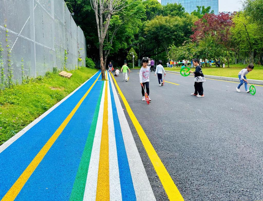 色彩鮮明、形象直觀的七彩人行道作為校園周邊的統(tǒng)一空間語言,既提升了環(huán)境的友好性也保障了家長、師生出行安全。這是深圳市南山區(qū)的首條 " 兒童友好型 " 示范路。