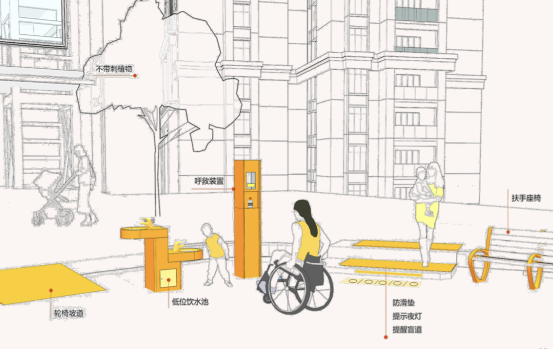 《規(guī)劃》要求,社區(qū)內(nèi)配套服務(wù)設(shè)施應(yīng)符合無障礙服務(wù)設(shè)計(jì)要求,有條件的還應(yīng)結(jié)合物聯(lián)網(wǎng)提供網(wǎng)購快遞到戶、外賣送餐到戶、呼叫醫(yī)療救助、安排志愿服務(wù)等社區(qū)共享服務(wù)。社區(qū)內(nèi)主要室外活動(dòng)場(chǎng)所設(shè)有臺(tái)階時(shí),其臺(tái)階起止處應(yīng)設(shè)置提示夜燈、提示標(biāo)識(shí)和提示盲道,應(yīng)配置具有扶手和靠背的休息座椅。