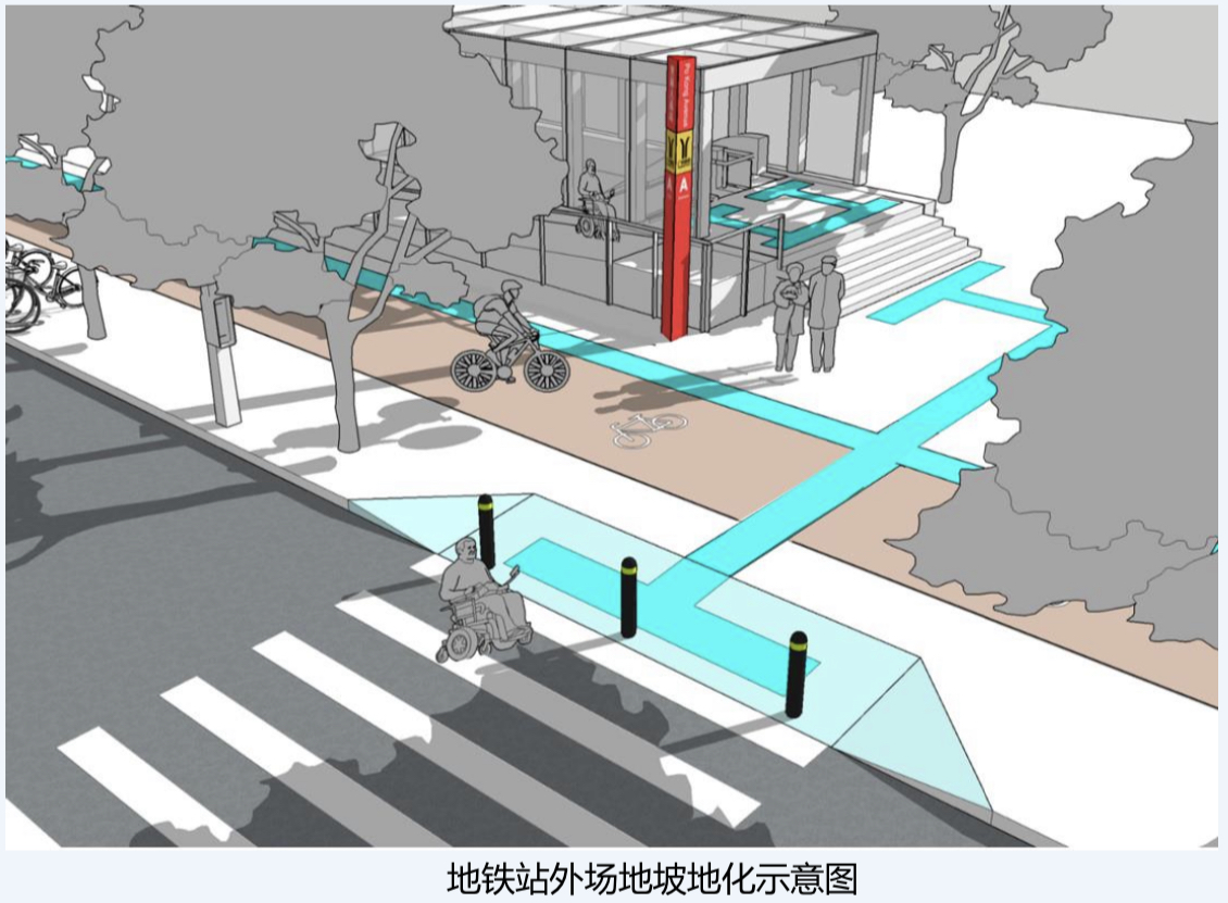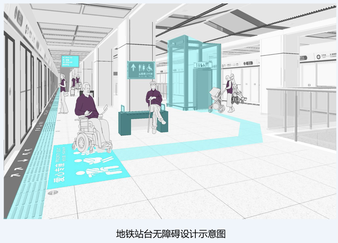 《規(guī)劃》要求,梳理有條件改造的地鐵站點(diǎn)無障礙設(shè)施,2025年前完成有條件改造設(shè)施總量的80%。地鐵站的出入口(有無障礙設(shè)計(jì)要求的)應(yīng)為無障礙出入口,地面宜為平坡地形。地鐵站內(nèi)外應(yīng)規(guī)劃設(shè)置行進(jìn)盲道和提示盲道系統(tǒng),其盲道系統(tǒng)應(yīng)與站臺(tái)層的無障礙電梯和出入口直接相連,與周邊公交站點(diǎn)、平面和立體過街設(shè)施、停車場(chǎng)所、出租車??课?、建筑出入口、周邊配套商業(yè)服務(wù)設(shè)施等相連,并應(yīng)在主要通行節(jié)點(diǎn)設(shè)置盲文標(biāo)識(shí)或電子標(biāo)簽等智能導(dǎo)示設(shè)施。