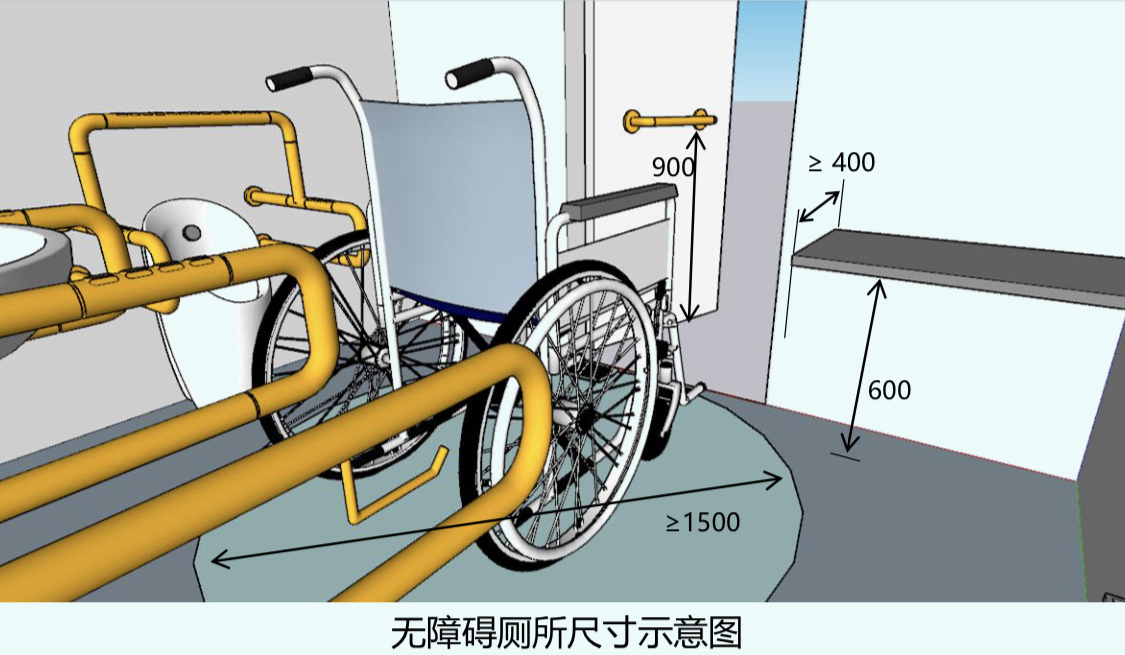《規(guī)劃》明確,無障礙廁所位置應(yīng)靠近公共衛(wèi)生間(廁所),面積不應(yīng)小于4.00㎡,內(nèi)部應(yīng)留有直徑不小于1.50m的輪椅回轉(zhuǎn)空間,內(nèi)部應(yīng)設(shè)置無障礙坐便器、無障礙洗手盆、多功能臺(tái)、低位掛衣鉤和救助呼叫裝置,應(yīng)設(shè)置水平滑動(dòng)式門或向外開啟的平開門。